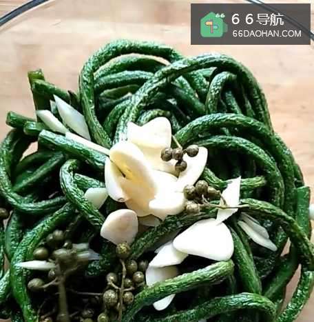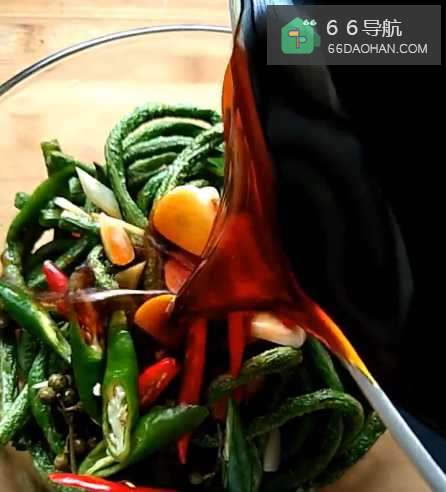 4把锅烧开后,关火凉透在豇豆中加入蒜姜片,青红尖椒,鲜花椒;