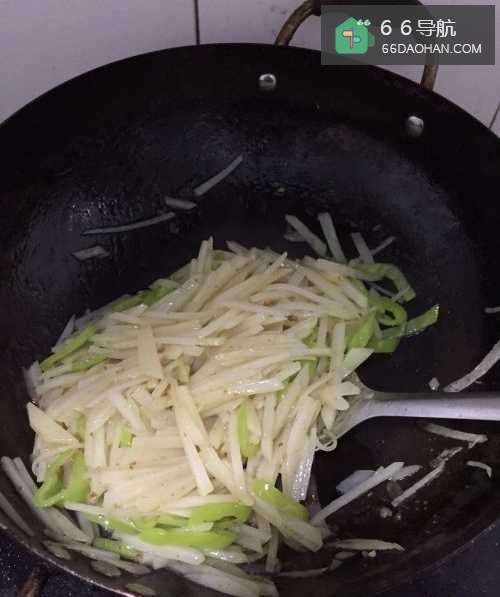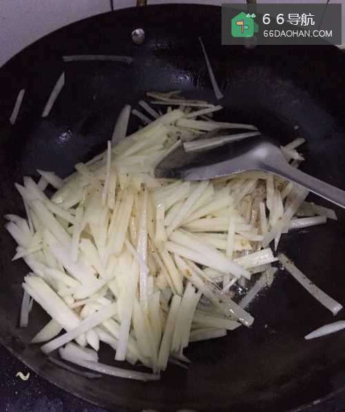 3锅中加入适量植物油,油热后放入切好的土豆丝,翻炒两下。
