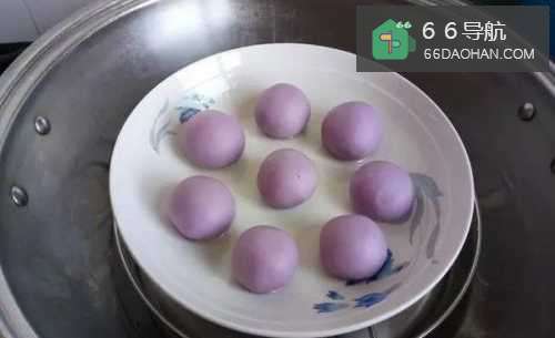8准备一个盘子,抹油,放上包好的紫薯糯米团子,蒸10分钟左右。