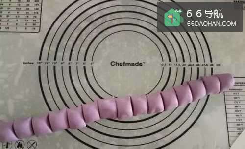 3把面团在揉面垫上滚成长条,用刮板切成大小相等的剂子。