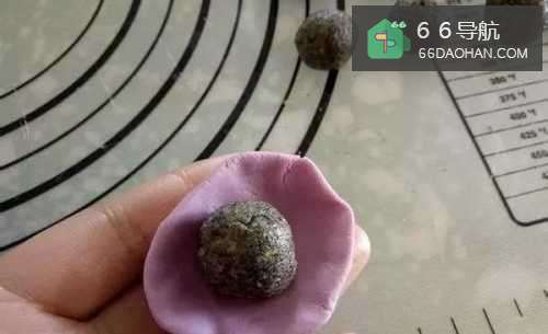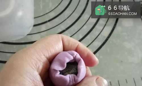 6取一块面团,压扁,捏成碗状,放上一个馅料