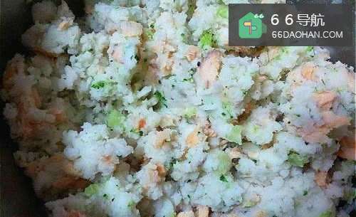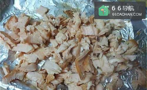 2鲑鱼洗净后用厨房纸巾擦干,抺上1茶匙盐,二面抺均匀,放到铝箔纸上,入烤箱烤至熟透,用叉子剥开备用。