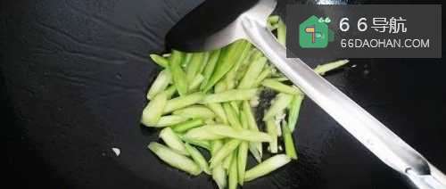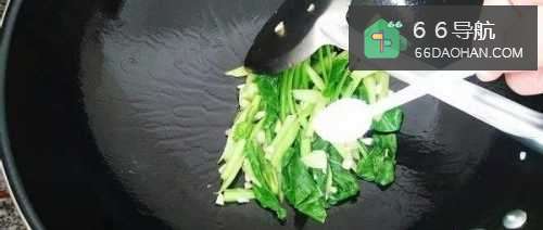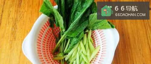 4将锅洗净,烧热倒油,放入蒜末煸香后,先把芥蓝杆放下去翻炒几下,随即再倒入芥蓝叶一同翻炒。