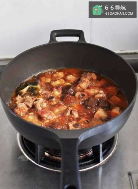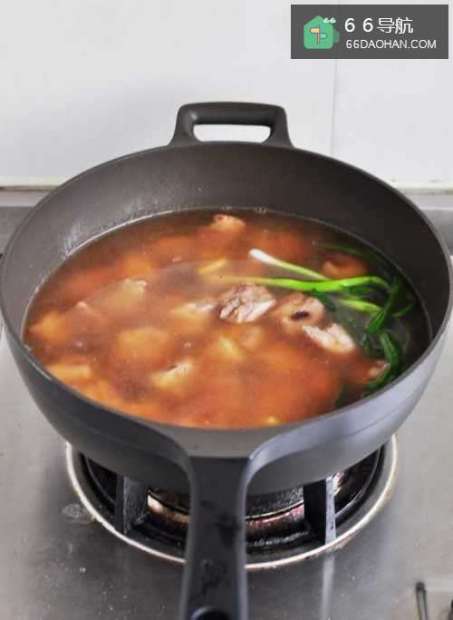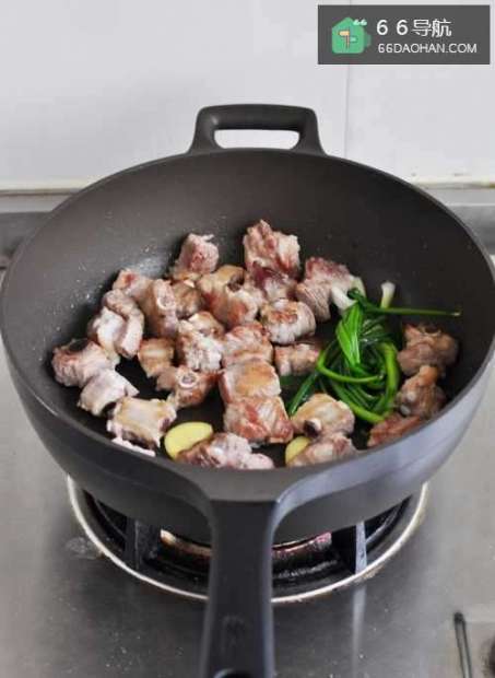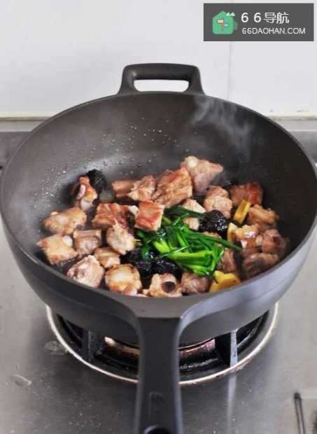 4锅里放油,把排骨煎微黄,放入葱姜继续煎一会。
