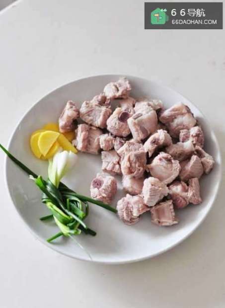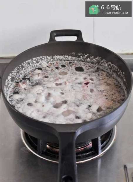 2锅里放水和干花椒煮沸,把切成小块的小排焯水。