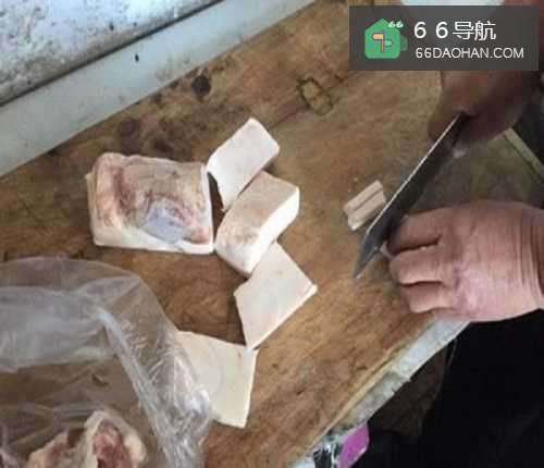 2将猪肥肉切成1厘米见方的长条,并塞入猪肝内两圆孔内。