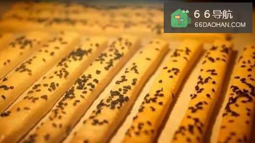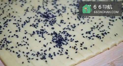 5把黑芝麻粉匀称地撒到红薯面饼的表层,随后把饺子皮切割成一条条的小条形