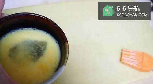 4把揉好的白薯面糊用擀面棍擀成长方形,用一个小盘子打进鸡蛋液,拿一把小软毛刷把鸡蛋液匀称刷在饺子皮的表层