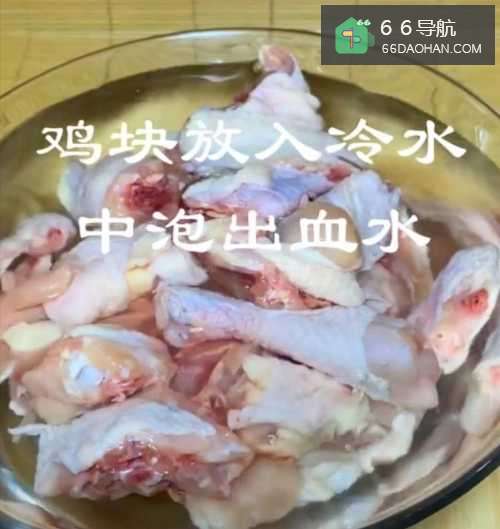 鸡块放入冷水中泡出血水,捞出盛盘备用。