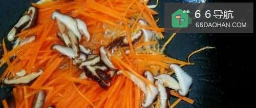 7锅内添点油,煸香大蒜丝,倒入胡萝卜和香菇丝炒至断生后,下入面条。