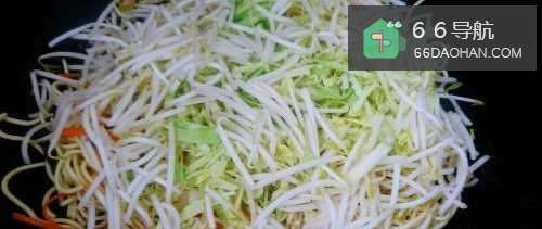8倒入绿豆芽和包菜丝,翻炒片刻,淋入事先调好的碗汁,一同翻炒。