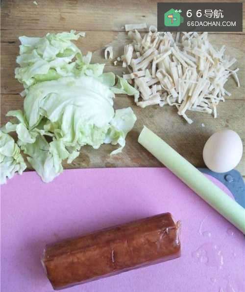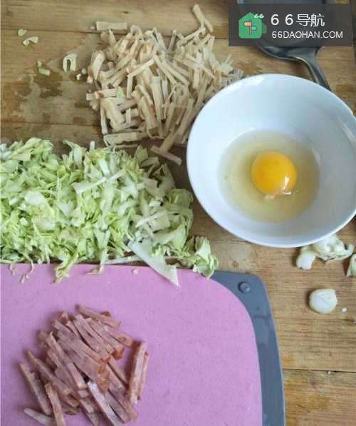 2将洋白菜、火腿、葱、大饼切成丝,将鸡蛋打入碗中。