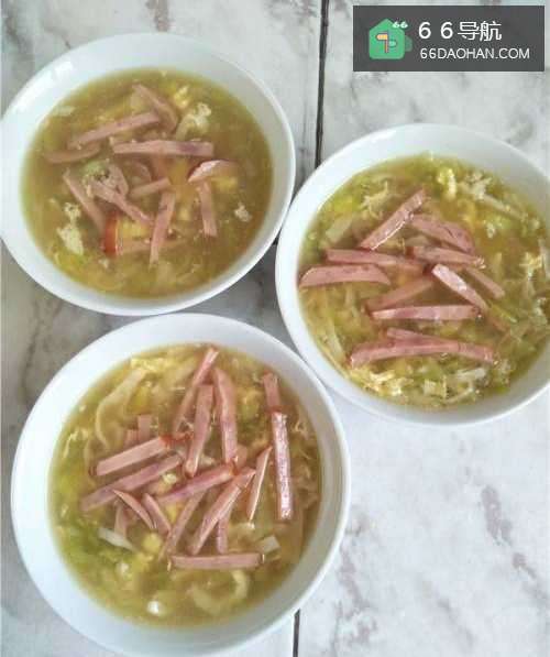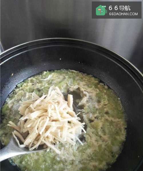 12再用铲子搅拌几下,就可以出锅了,盛入碗中,撒上火腿丝,就可以喝到美味的饼丝汤了。