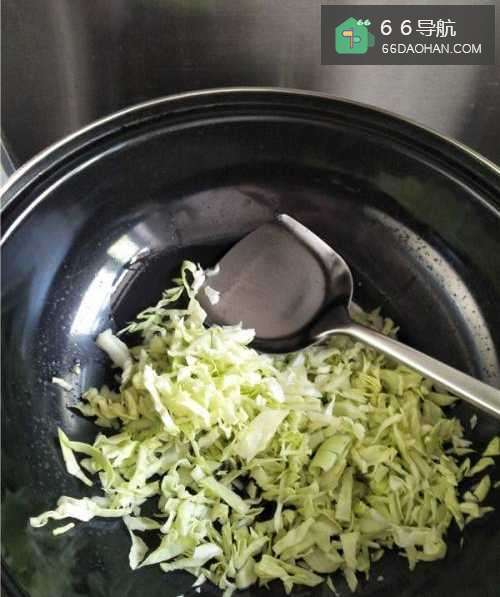 4将洋白菜丝先倒入锅中,用铲子搅拌,炒出香味。