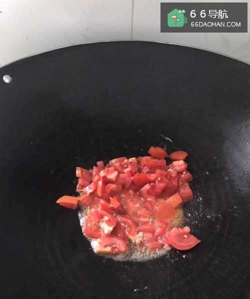4炒锅放油,把蒜米爆香,把番茄倒进去,翻炒一会。