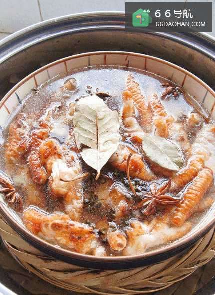 4水中放一两片香叶和八角,放入刚炸制好的鸡爪浸泡。