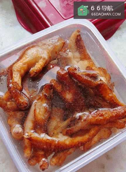 4.中放一两片香叶和八角,放入刚炸制好的鸡爪浸泡