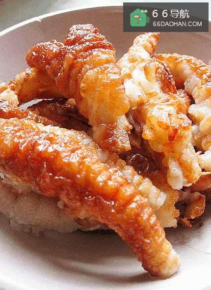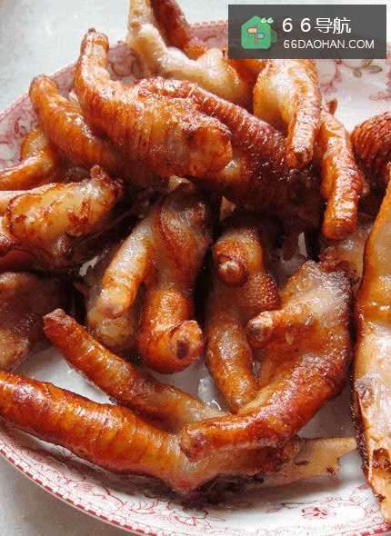 3锅内油放的宽些,入鸡爪炸至焦黄。