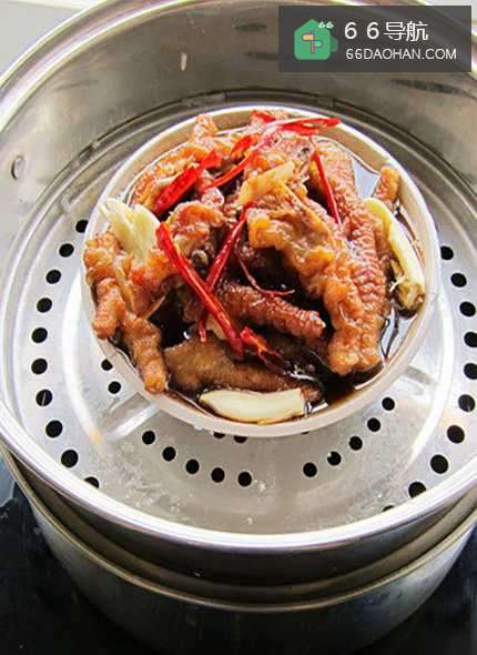 8蒸制好的鸡爪淋上葱油、混合芡汁、鸡精、麻油、蒜粒、干辣椒丝再上火蒸10分钟,焖5分钟即可。