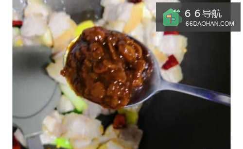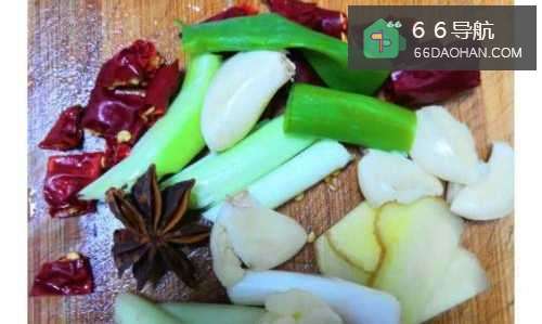 4锅里放油烧热放入葱姜蒜,干辣椒、八角炒香,转中火,放入切好的五花肉炒一分钟,放一勺黄豆瓣酱、老抽、少量清水,生抽翻炒。
