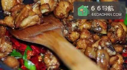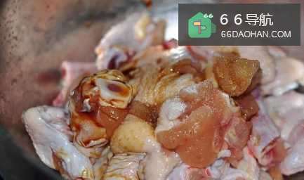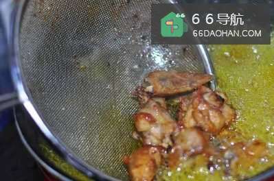 5起锅热油,油温六七成热时下入鸡块炸熟颜色变深