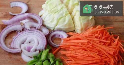 2把洋葱切成条状,包菜切成片,胡萝卜切成丝备用