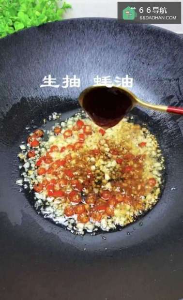4另起锅烧油,油热下蒜末、小米辣,生抽、耗油炒香