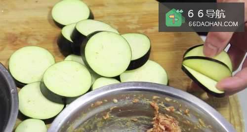 44.茄子一块一块切好以后,取出肉馅把肉馅旁边准备一小盆清水,先把小勺子粘一点清水,防止肉馅粘在勺子上面,挖点肉馅把茄夹装满肉馅,用勺子按一按,可以多装一点肉馅吃起来更香更解馋