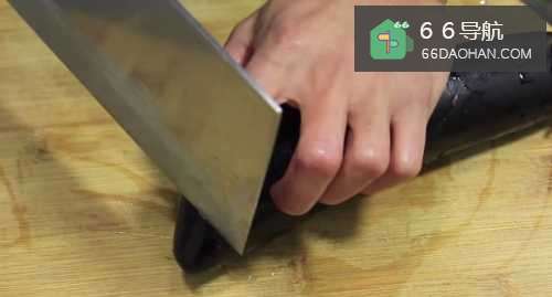 33.这个时间我们把茄子处理一下,切去茄子的蒂和尾部,如图中所示第一刀和第二刀不要切断茄子 从第三刀处切断,每一刀的厚度0.3厘米。