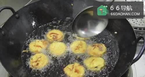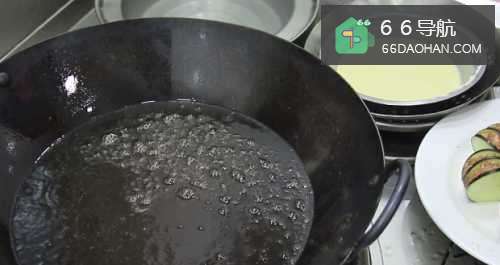 77.内烧油,油温烧至5成热后,把茄夹挂上面糊,放入到锅内炸制,小火慢炸把茄夹的表面炸制金黄,浮出油面后即可捞出控油。