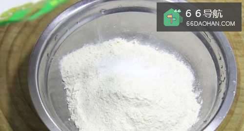 66.准备一个小盆,放入面粉、淀粉、泡打粉2克、白糖2克,加入清水搅拌成糊,在打入一个鸡蛋充分搅匀。