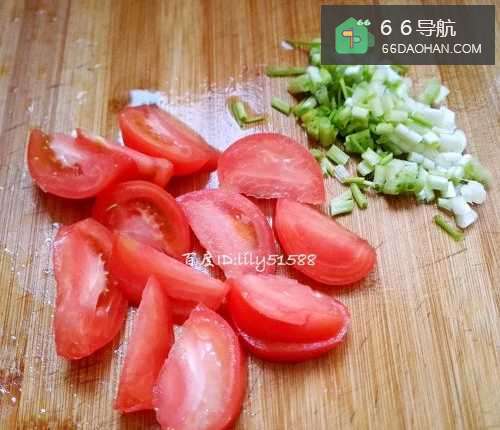 2准备好小葱和西红柿洗干净,将西红柿切块,小葱切段备用。