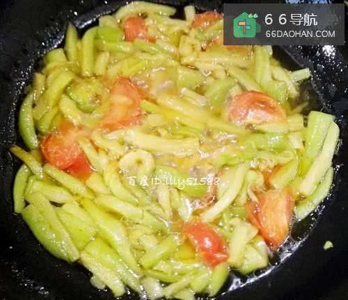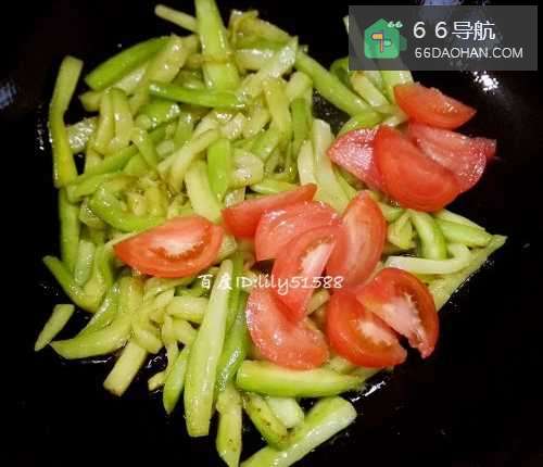 4茄子炒软了之后,放入西红柿一起炒几下。
