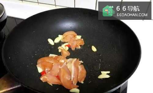 3中大火爆香蒜头、辣椒,然后放入鸡肉快炒