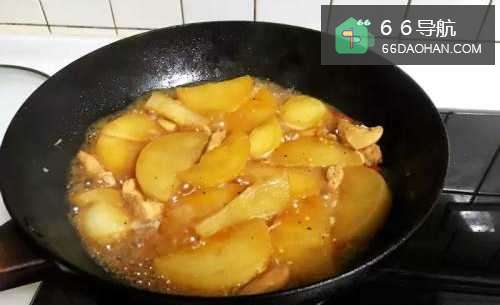 4鸡肉炒至3、4分熟时,倒入2碗水,加入酱油、米酒、糖调味,然后放入白萝卜用小火炆煮