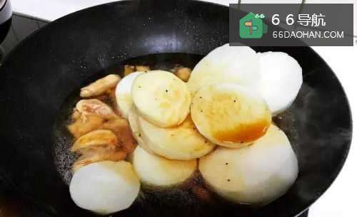 5白萝卜炆煮15分钟左右,有点软时可用锅铲将萝卜切半,让萝卜更好的入味。