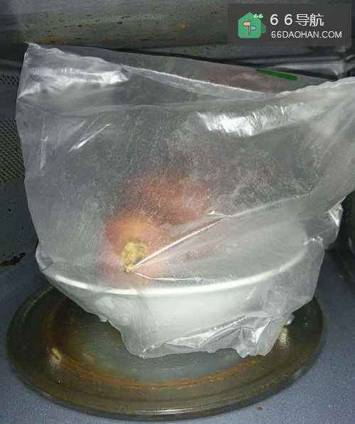 6十五分钟以后,把红薯碗慢慢端出来,去掉上面的塑料袋,这时,碗里的水已经很少了,用手指按一下红薯,软软的,已经烤好了。