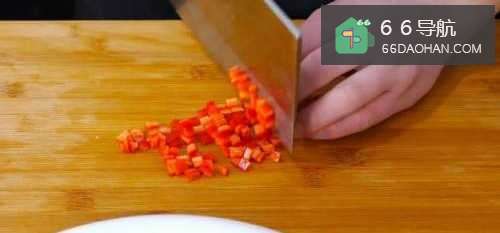 3青尖椒一根我们将其从中间对半切开,先切成细条,然后再切成小丁放入碗中备用。