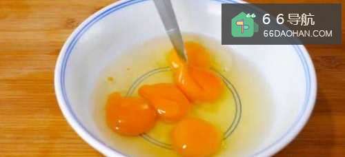 2接着再将准备好的鸡蛋打入一个碗中,鸡蛋打好之后,我们用刀子在它的蛋黄上划散。