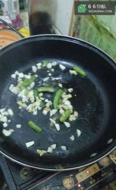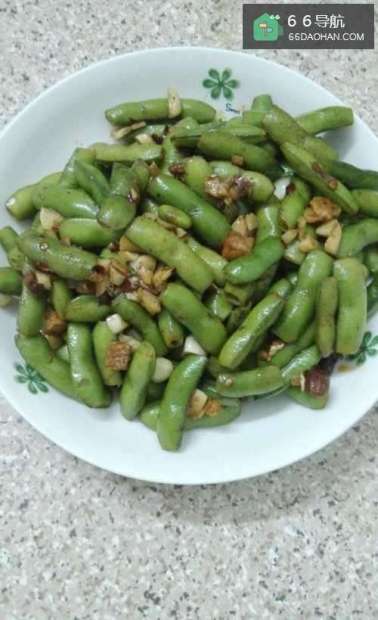 7三分钟左右就可以把腌制了一会的毛豆给下锅,和蒜末一起翻滚吧!火候不要太大,如果锅底不平整的话容易糊掉的哦!