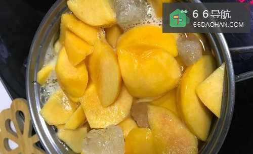 4放入锅中,加入刚刚没过黄桃的水,加入冰糖,水开后小火继续煮十五分钟