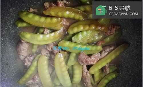 6先加入牛肉卷,将其炒香,然后倒入腌制的荷兰豆,混合翻炒。