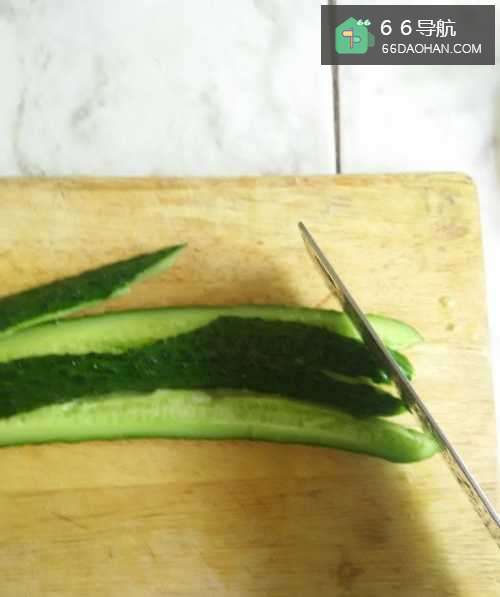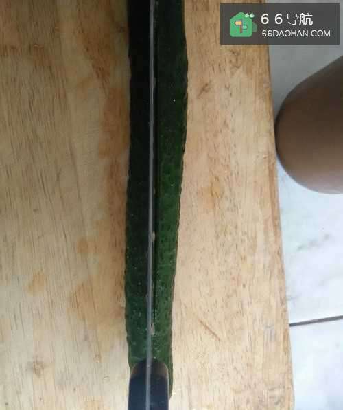2用刀先在黄瓜中间切一刀,把黄瓜分成两半。