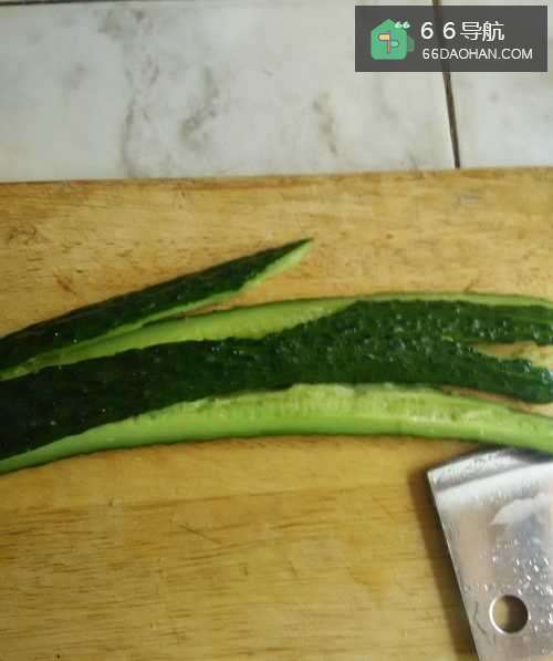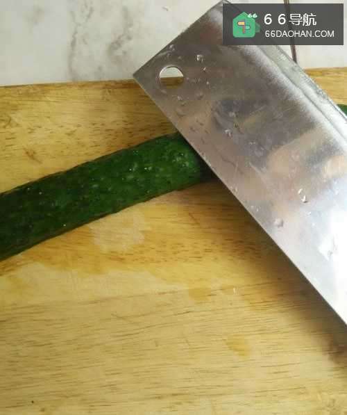 3把黄瓜平放在菜板上,用刀先拍右端。