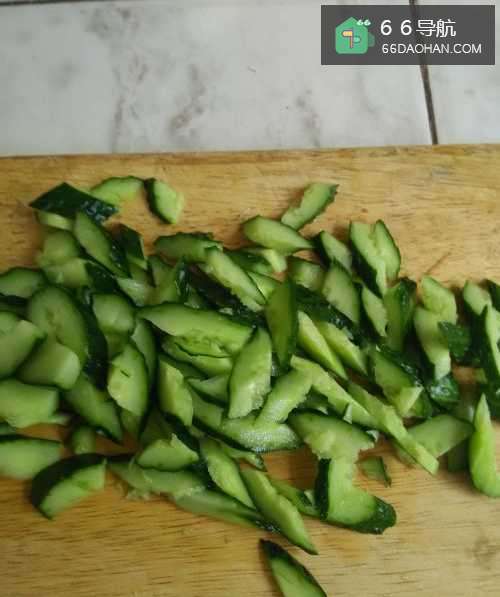 6保持同样的厚度,从右向左把黄瓜全切完,切成均匀的小块。