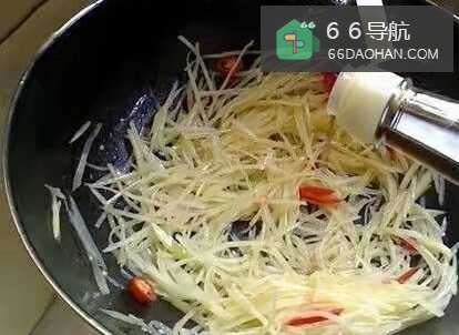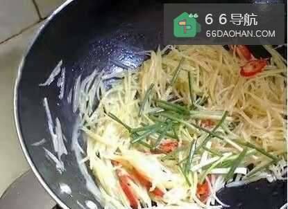 7最后加入葱段炒匀即可,一盘美味的酸辣土豆丝就做好。