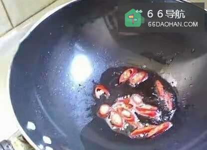 4然后炒锅放入适量的花生油,把辣椒,蒜末放入爆一下。