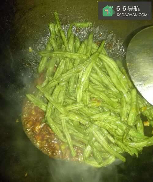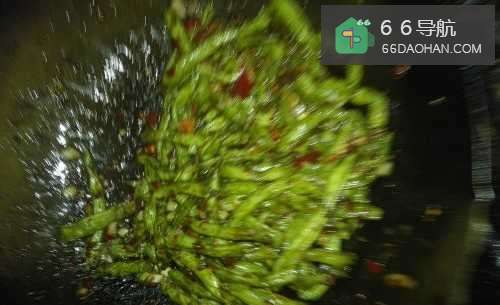 5加一点水,加豆角,翻炒!!让豆角粘匀调料!!