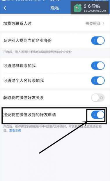 4在隐私界面,选择【接受我在微信收到的好友申请】,点击【开关】开启即可。