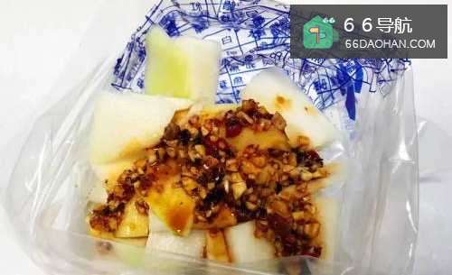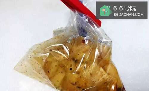 4腌好的大头水会出水,把水倒掉后,用凉的饮用水冲一下大头菜,然后放在食物袋子里,倒入酱料